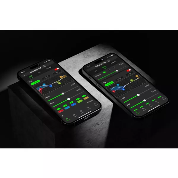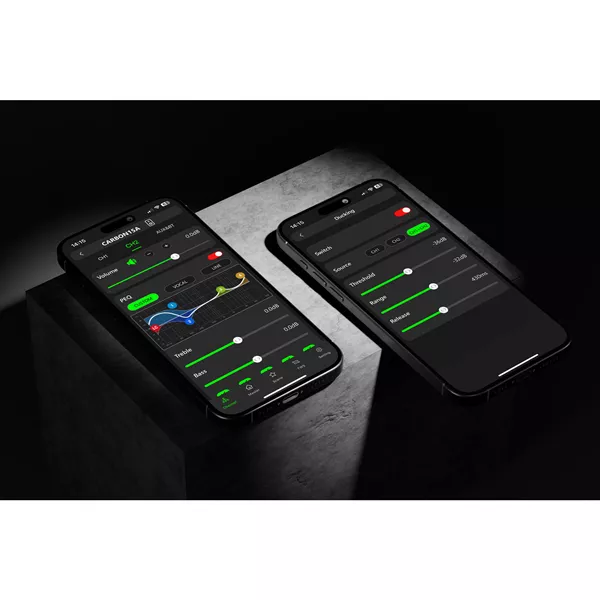 - 4-kanaals besturingsapplicatie met instellingen, parametrische equalizer (PEQ), scènes, positie en vertraging.